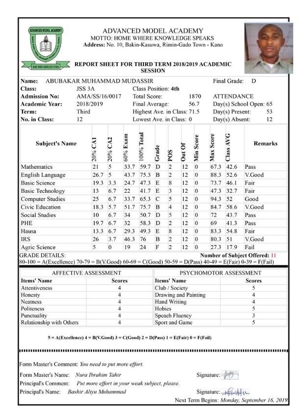 From the entries of subject teacher and form master, an organized and comprehensive report sheet which include subjects list, scores for CA’s and exams, total score, grade, remark, highest and lowest score, subject teacher’s name, students’ passport, class position and more can be generated with just a click of button.